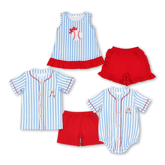 Matching Baby boys puppy baseball blue stripe romper outfits short sleeves embroidery