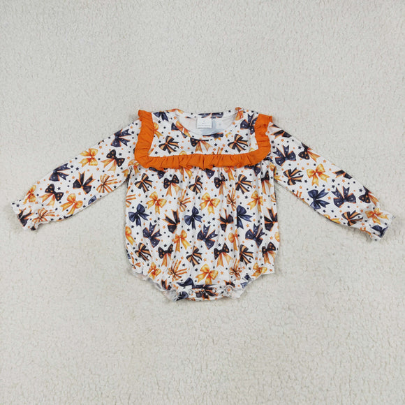 LR2642 baby girls Mardi Gras bow purple floral romper