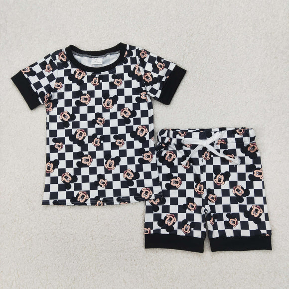 BSSO1621 Boys Embroidered fish short sleeve blue checkered shorts outfits