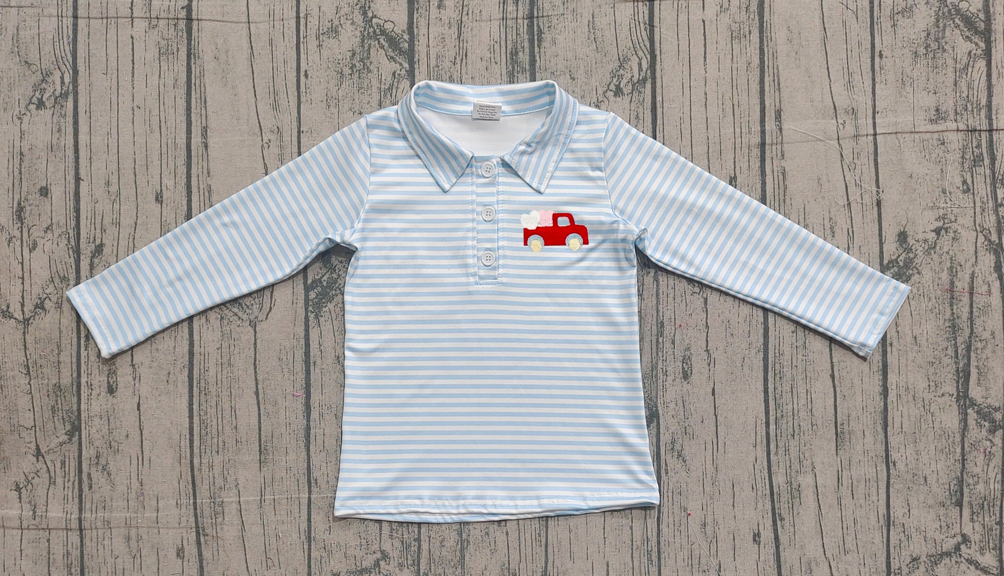 11.15 Pre-order BT1573 baby boys Valentine's embroidered tractor button blue stripe top