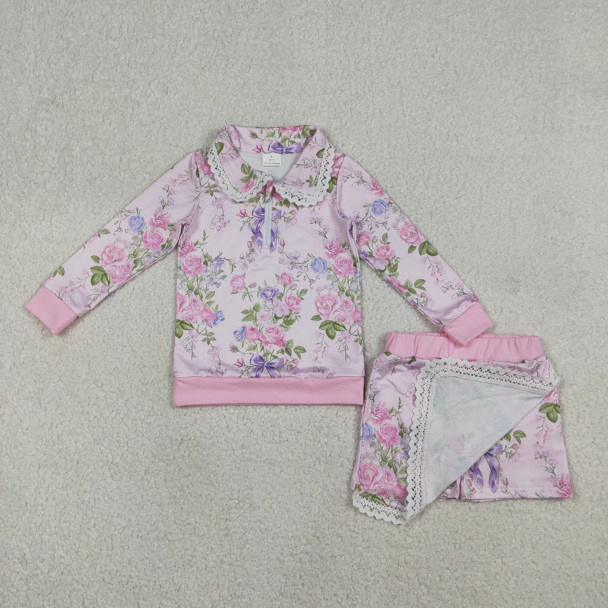 GLD1572 girls flower pink long sleeve zipper skirt outfits