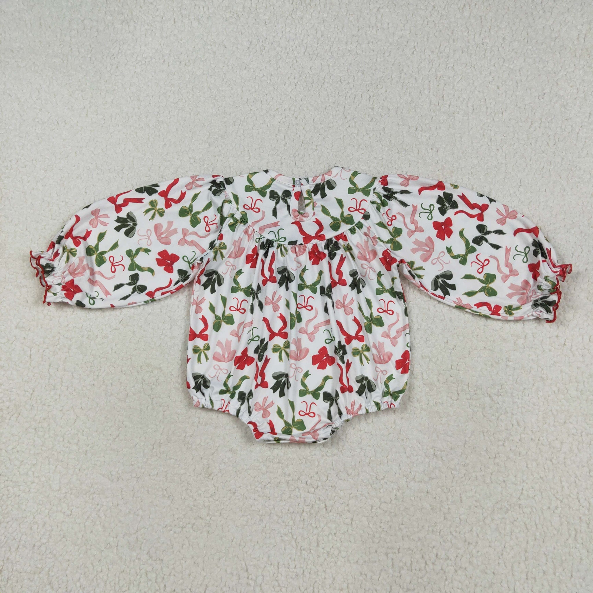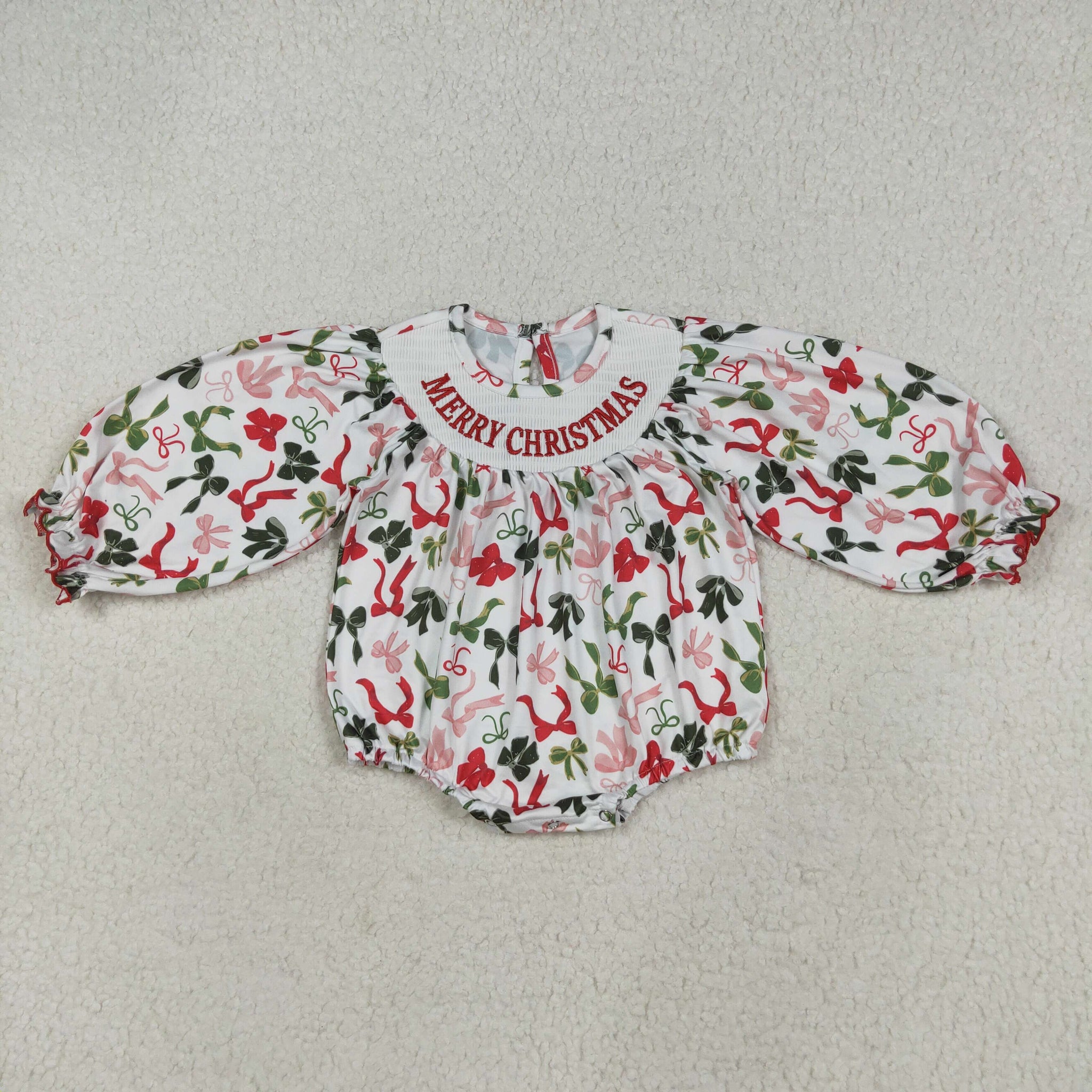 LR2276 baby girls MERRY Christmas green red bow romper smocked