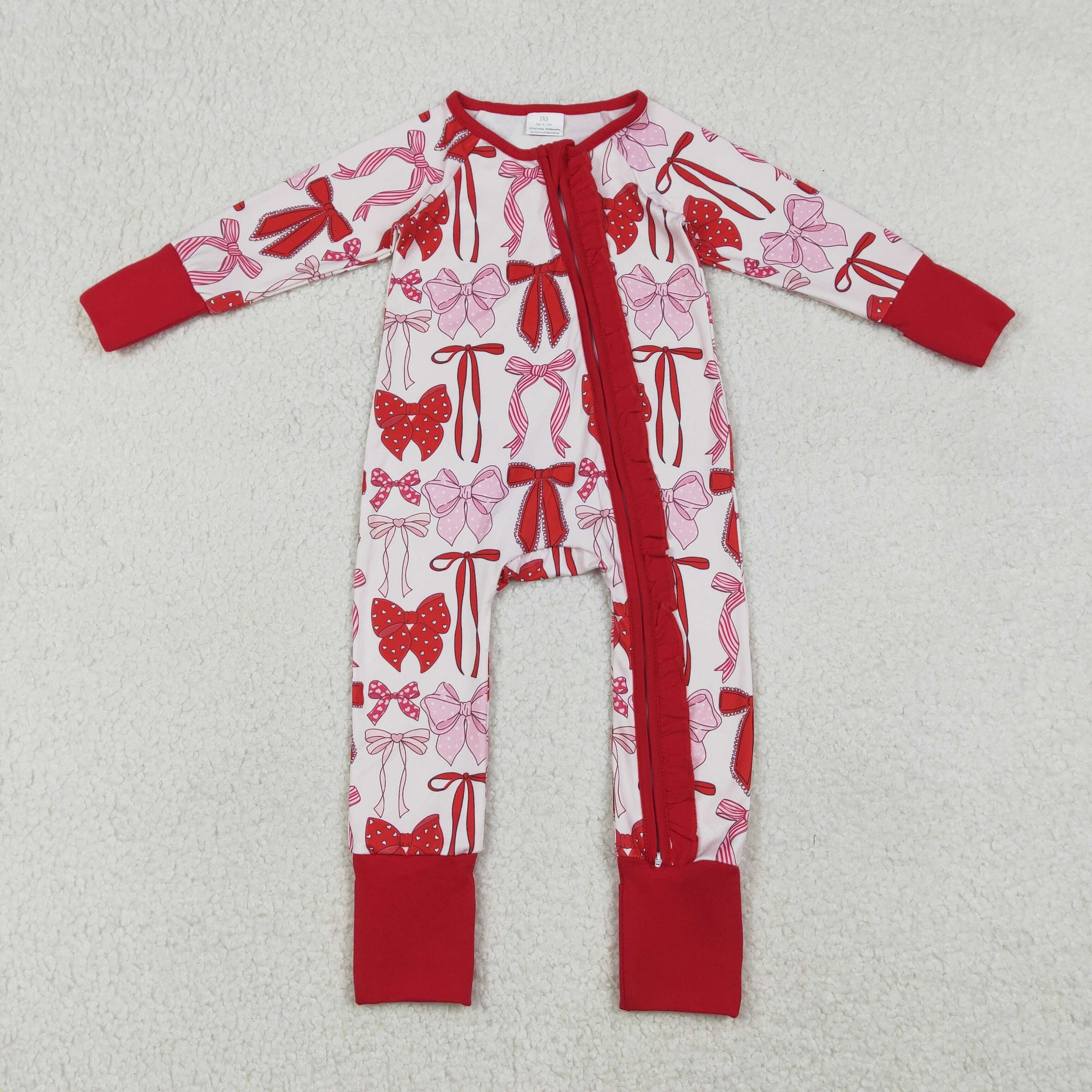 LR2780 baby girls pink red bow zipper long sleeves romper