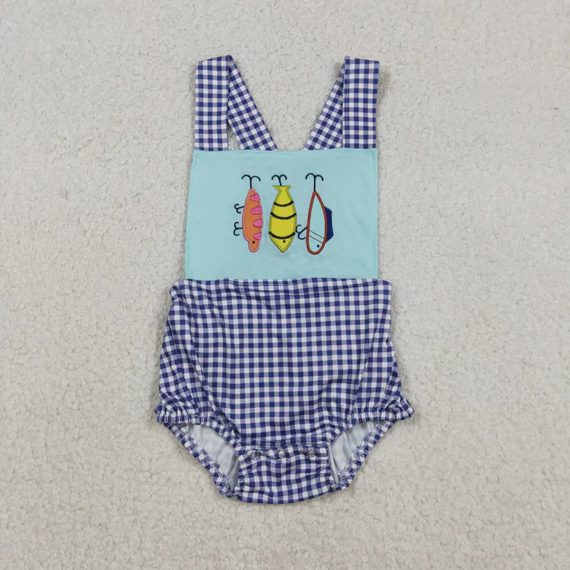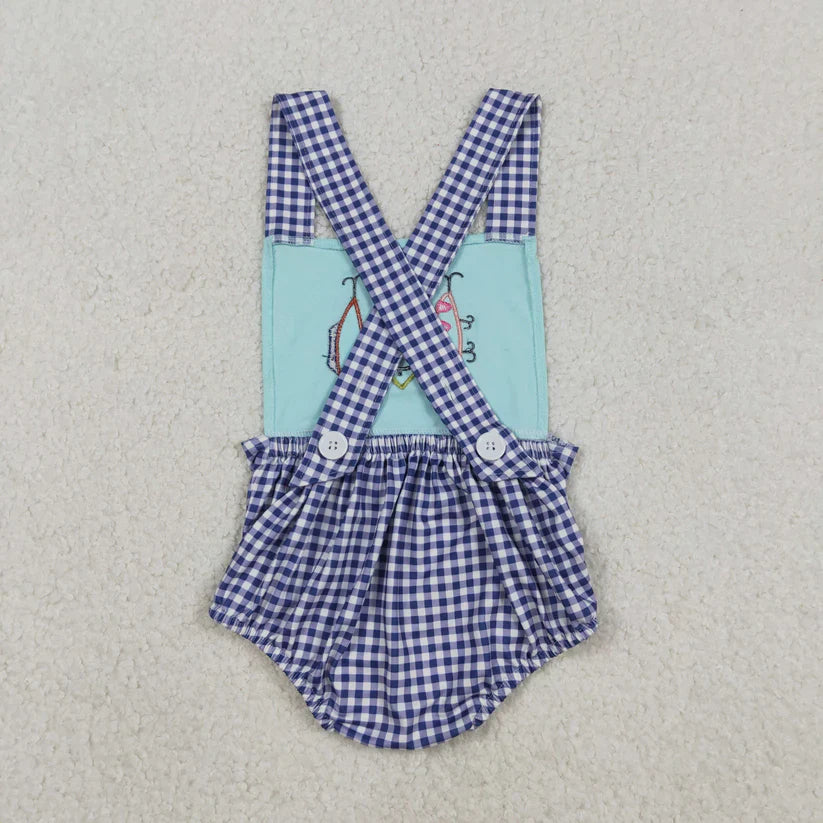 Matching Baby girls boys fish checkered romper outfits embroidery