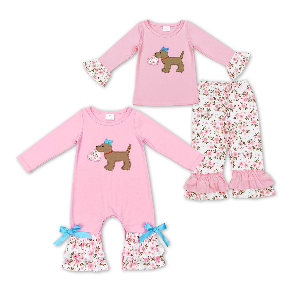 Sibling matching Valentine's day embroidered dog floral pink clothing