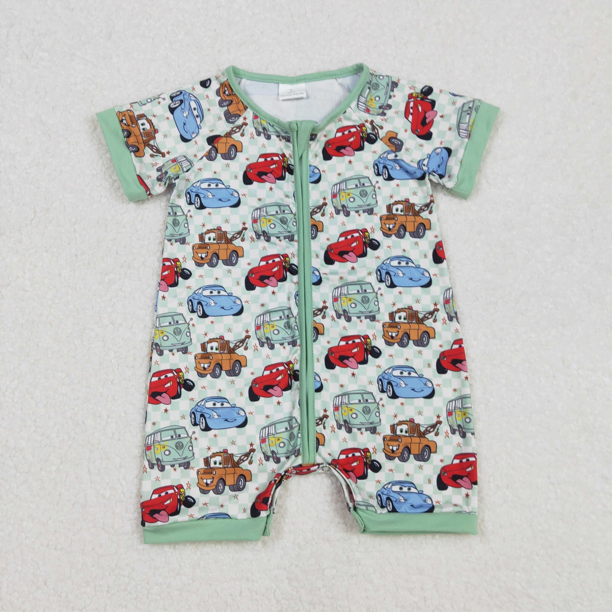 SR2373 Baby boys cartoon car green plaid zipper romper